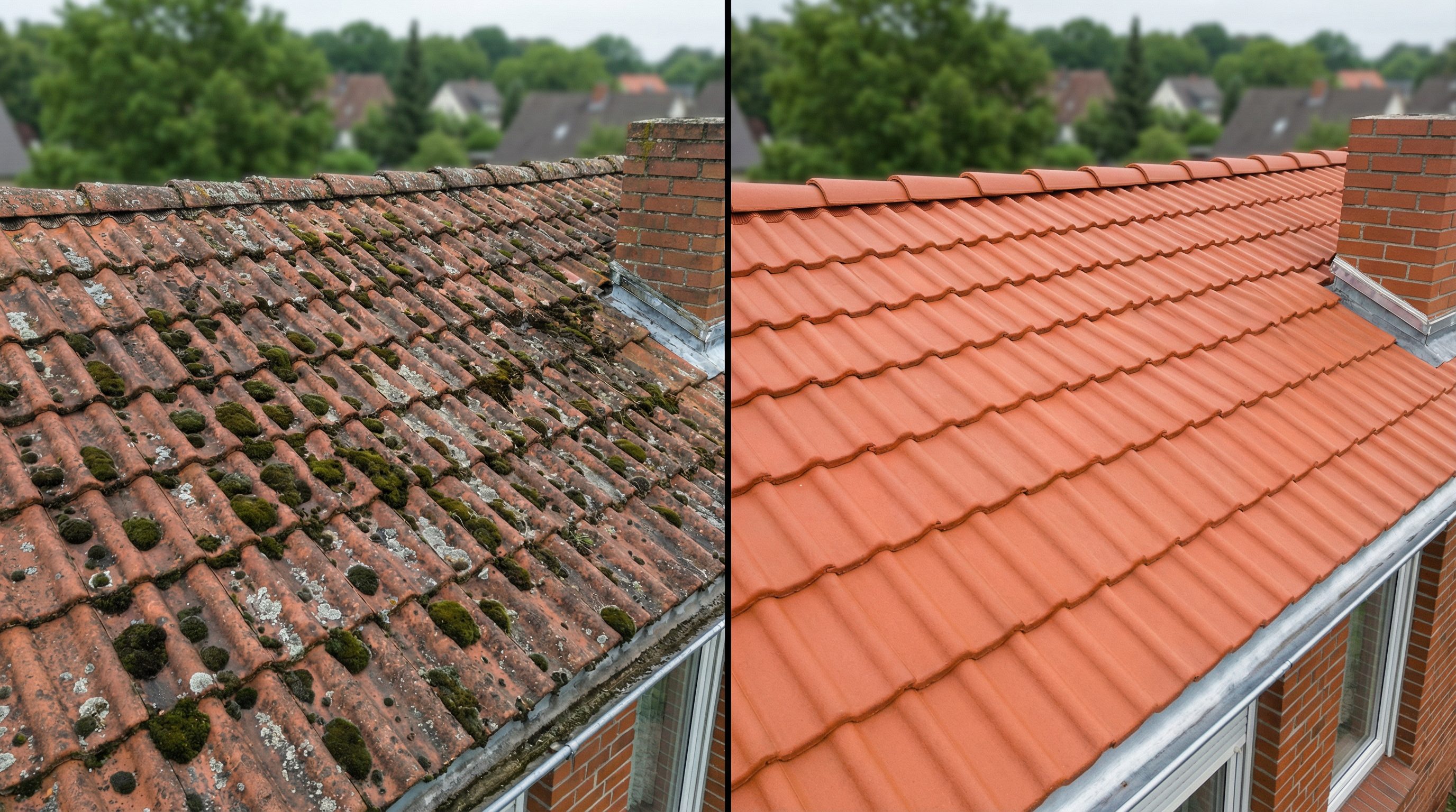 Links: Dach vor der Reinigung mit starkem Moosbewuchs. Rechts: Dasselbe Dach nach professioneller Hochdruckreinigung.