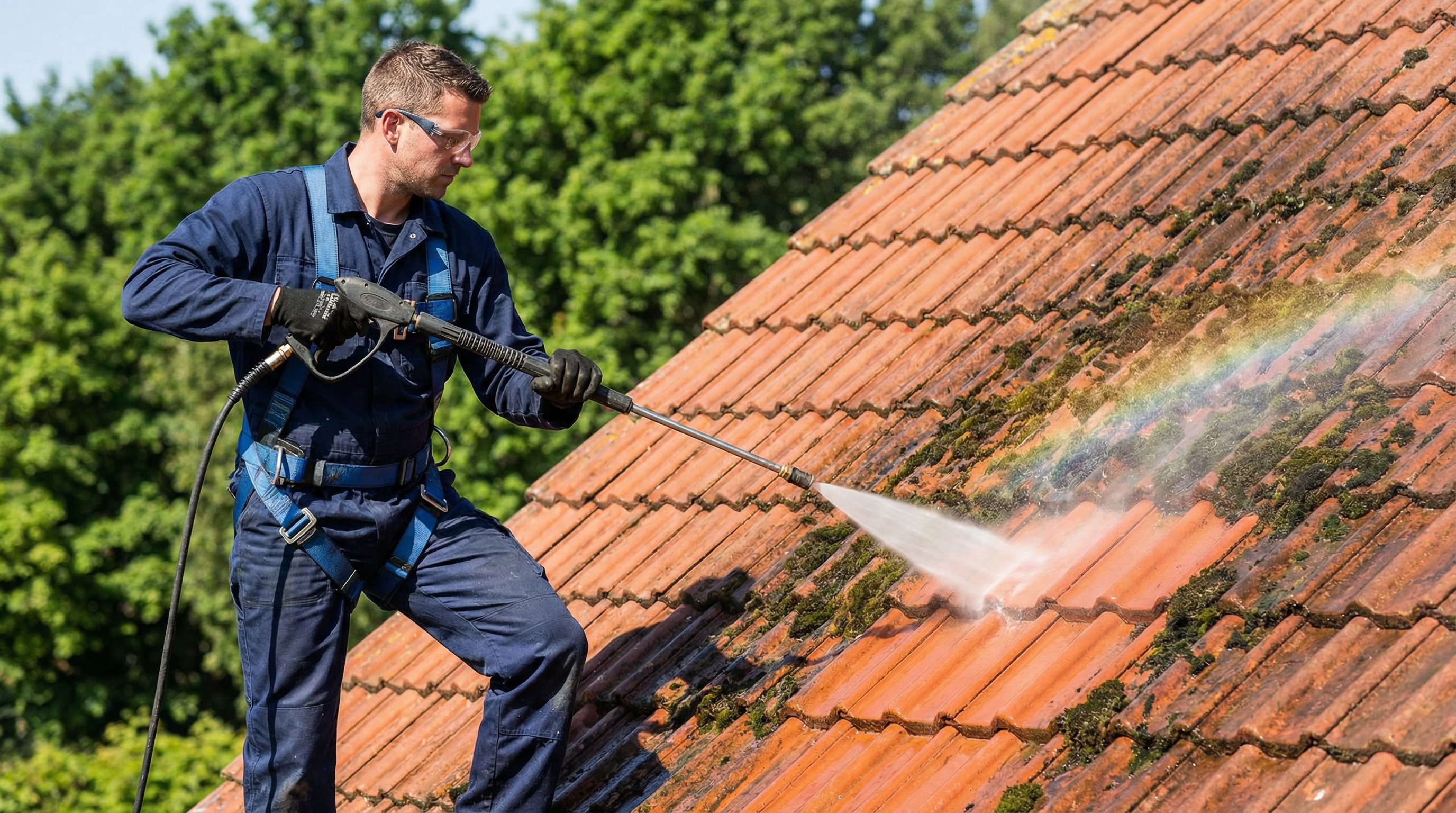 Die fachgerechte Anwendung ist entscheidend: Der Wasserstrahl wird in Abfließrichtung geführt und der Druck an das jeweilige Material angepasst – ob Tonziegel oder Betondachsteine wie die weit verbreitete Frankfurter Pfanne.